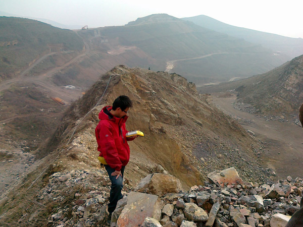 圖為該所工作人員在涇陽(yáng)縣巖實(shí)采石場(chǎng)進(jìn)行實(shí)地勘測(cè)時(shí)的情形
