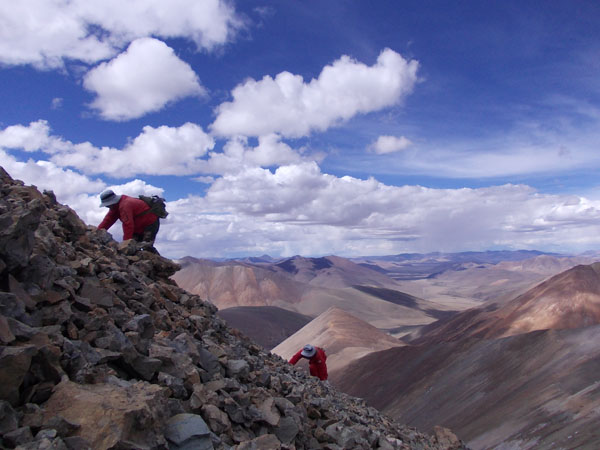 該項目是中國地質(zhì)調(diào)查局2013年地質(zhì)礦產(chǎn)調(diào)查評價專項總體部署在西藏地區(qū)重點成礦區(qū)帶——岡底斯成礦帶的地質(zhì)礦產(chǎn)調(diào)查項目。工作周期為3年,調(diào)查區(qū)行政區(qū)劃屬阿里地區(qū)措勤縣管轄,區(qū)內(nèi)人跡罕至,交通情況極差,最低海拔在5000m以上,最高海拔在6296m。我院工作人員通過近3年的辛苦工作,克服了洪水、野獸出沒等困難,取得了較大的地質(zhì)礦產(chǎn)成果。地質(zhì)方面,完成區(qū)調(diào)填圖面積1779km2、合理建立了調(diào)查區(qū)的地層層序、新發(fā)現(xiàn)了多個地質(zhì)單元、厘定了調(diào)查區(qū)內(nèi)的火山噴發(fā)旋迴及韻律、建立了調(diào)查區(qū)的侵入巖序列等;礦產(chǎn)方面,共新發(fā)現(xiàn)1處鉛鋅多金屬礦點、1處銅多金屬礦化點和3處黃鐵礦礦化蝕變帶,其中西藏措勤縣瑪圭鉛鋅多金屬礦點海拔在5700-6100m,共發(fā)現(xiàn)12條礦體,2條礦化體,礦體最長在500m,最寬在100m,Pb最高品位6.19%、Zn4.87%、Ag278g/t,具有較大的找礦潛力。(姚勝 文/圖)