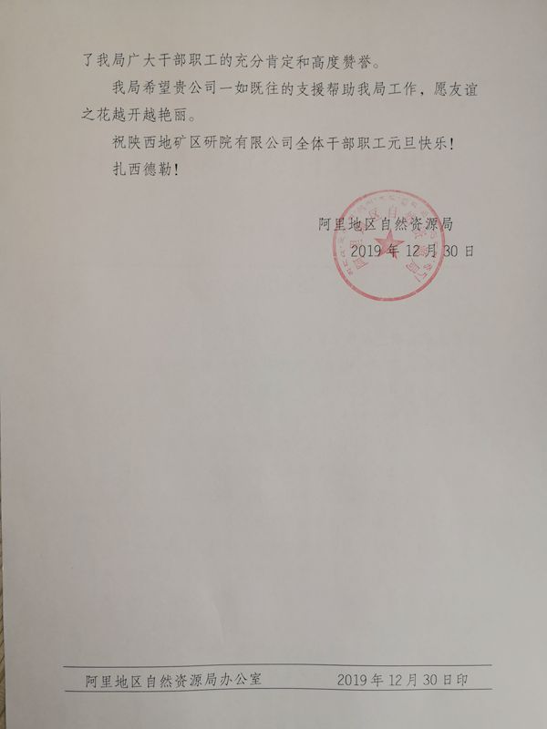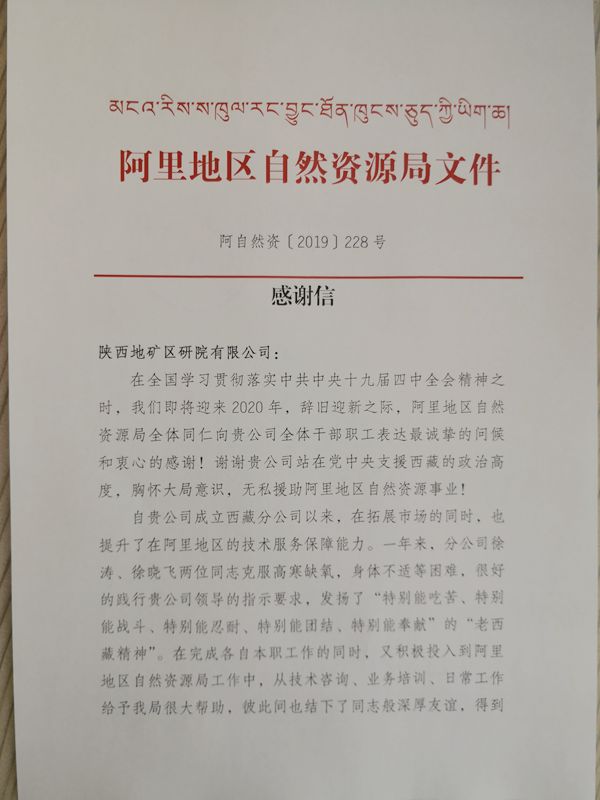 12月30日,我公司收到西藏阿里地區(qū)自然資源局發(fā)來的感謝信。對(duì)該單位胸懷大局意識(shí),發(fā)揚(yáng)老西藏精神,無私援助阿里地區(qū)自然資源事業(yè)進(jìn)行感謝,并表達(dá)了進(jìn)一步加強(qiáng)合作的期望。