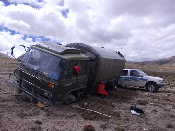 不幸的事情發(fā)生在8月21日開始工作的第一天,由于路況不熟悉,晚上回駐地時我們開的皮卡車卡在了河道的巖石之間,河水冰冷刺骨,盡管我們使出渾身解數(shù)也難以撼動它半步。而遠(yuǎn)方不到4km處就是我們的駐地,此時我們也只能望其興嘆。只能徒步趕回駐地啟動另一輛東風(fēng)大卡車就前來營救。然而,更不幸的是,在沒有路的山坡之間,加之夜色已晚,沼澤之上覆蓋著一層厚草,看不清路況,重達(dá)8噸的大卡車也陷入了沼澤中,前輪完全不見蹤影,大家瞬間“石化”了,兩輛車也面對著面相互“嘆息”。大卡車像一個困在泥淖的野獸,任憑怎么掙扎也無法撼動,反而是越陷越深,幾次掙扎之后四個輪子幾乎完全不見了,車廂托在了泥淖之上,一啟動就像一只被抓著脖子提起的鴨子,只見蹬腿,卻動彈不得。皮卡司機(jī)王迎坤大喊:“別動!越是啟動掙扎就陷得越深,等明天再作商議吧”。此時已經(jīng)是夜里十一點(diǎn)了,寒風(fēng)像冰窖里的冷氣一樣侵蝕著每個人的每一寸肌膚,大家也都覺得司機(jī)師傅的話有道理,所以盡管到駐地的4km距離內(nèi)還需過四五條冰冷刺骨的河流,大家都毫不猶豫深一腳淺一腳摸黑從河水中淌了過去,到達(dá)駐地已經(jīng)過了凌晨了,棉褲濕到齊腰上,竟能擰出大把的水來。大家用熱水泡了泡腳就都睡了,但深陷泥淖的兩輛車卻成了那個晚上每個人心里的牽掛。該怎么辦啊?
